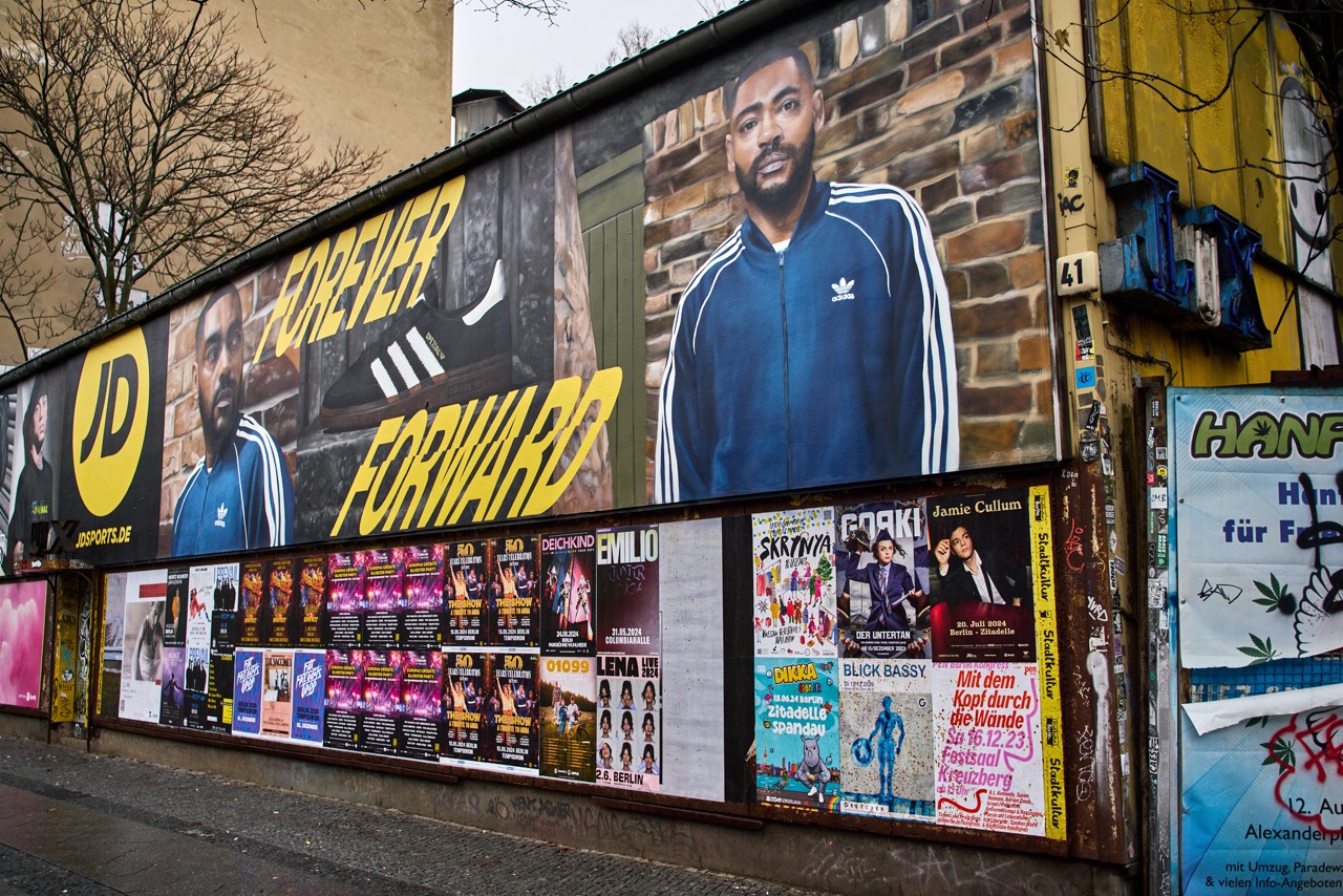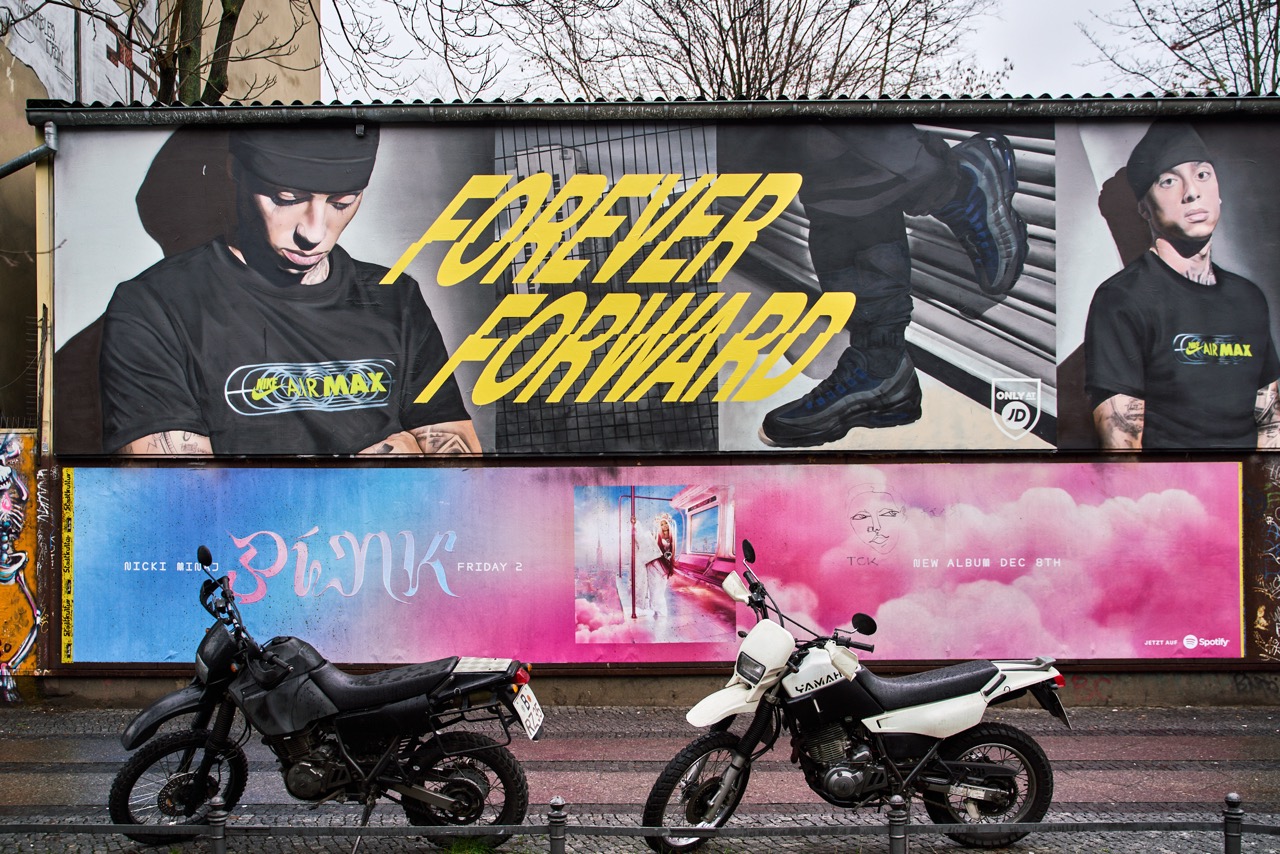 The murals combine fashion, movement, and attitude: iconic silhouettes, powerful portraits, and the striking slogan “Forever Forward” meet the raw, vibrant environment of Berlin.