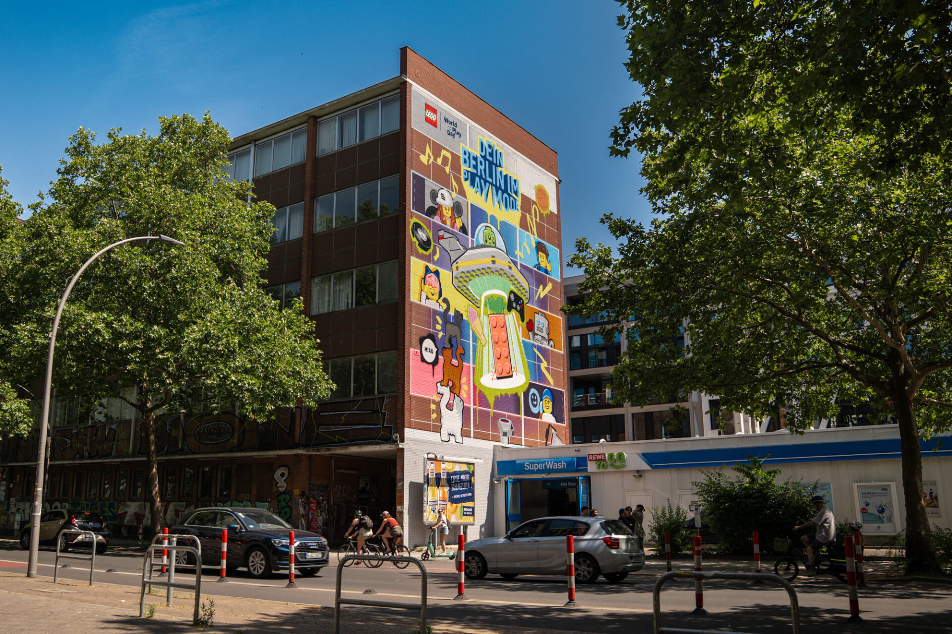 For World Play Day, CONCRETE CANDY brought a brightly coloured mural to life for LEGO in the heart of Kreuzberg. Covering an enormous area of almost 400 square metres, a playful mural was created close to the bustling Moritzplatz, celebrating the joy of building, playing and being creative.