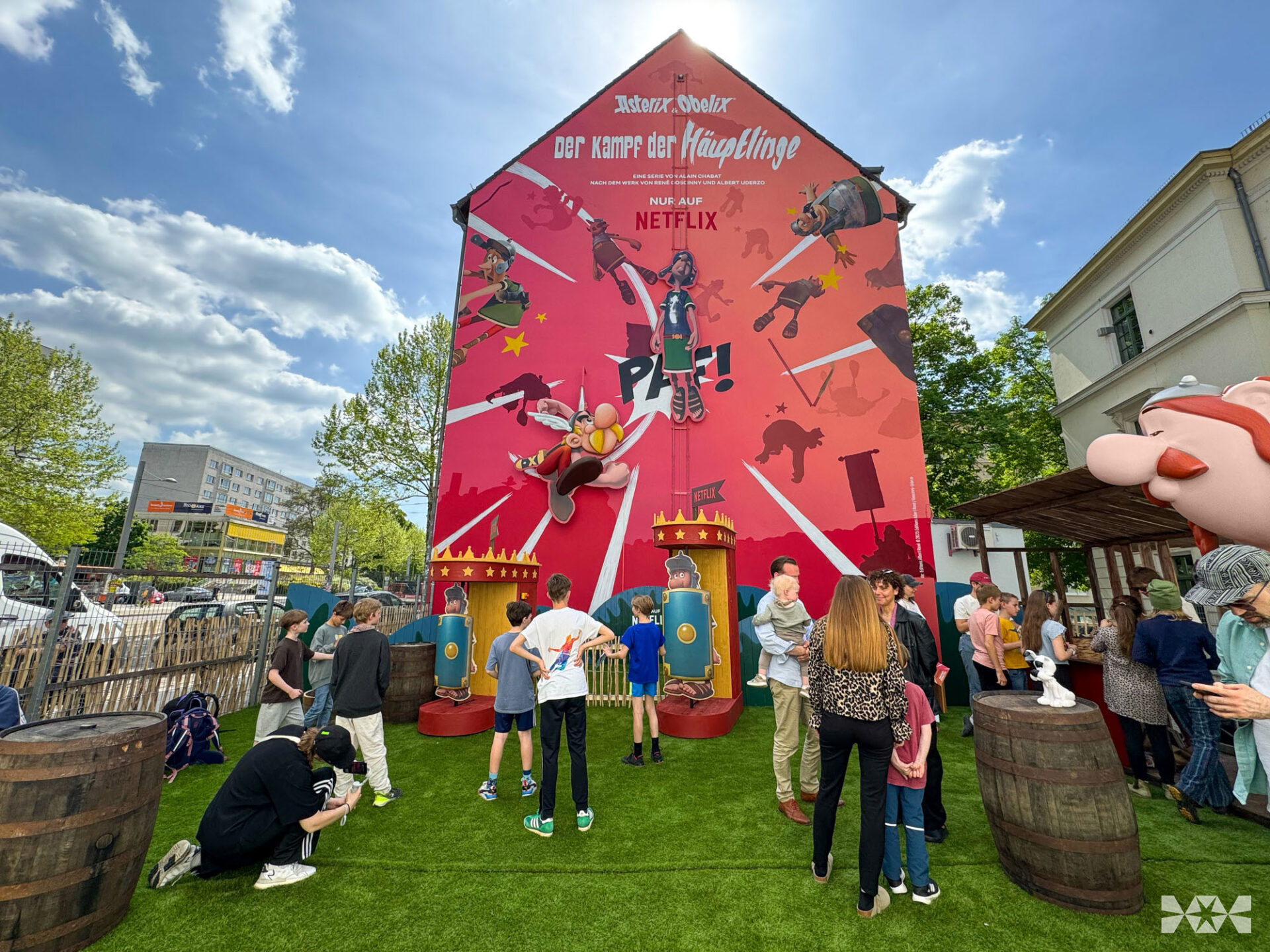 Asterix gives the Romans a punch, Obelix and Idefix welcome visitors as larger-than-life figures they can touch, while photo spots and interactive elements invite them to become part of the story themselves. A push on one of the Roman shields sets in motion a mechanism that was specially developed for this wall and, with Asterix's help, literally beats the life out of the Roman.