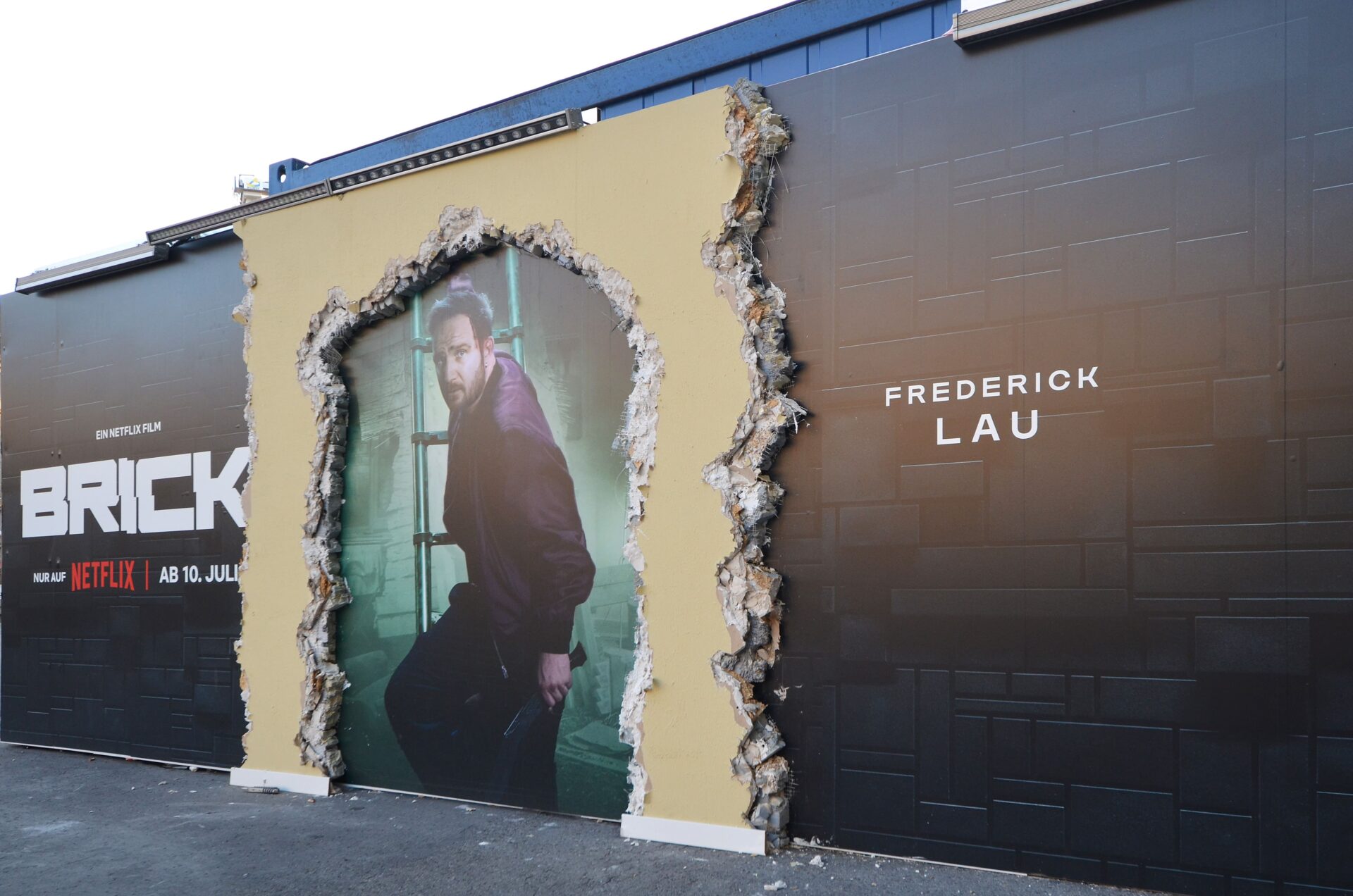 The implementation combines 3D illusion, painting and spatial staging – a special technique that makes the construction fence itself part of the story. Broken edges, layers of material and the play of light create the impression of a real breakthrough and allow a view of scenes and actors from the NETFLIX blockbuster.
