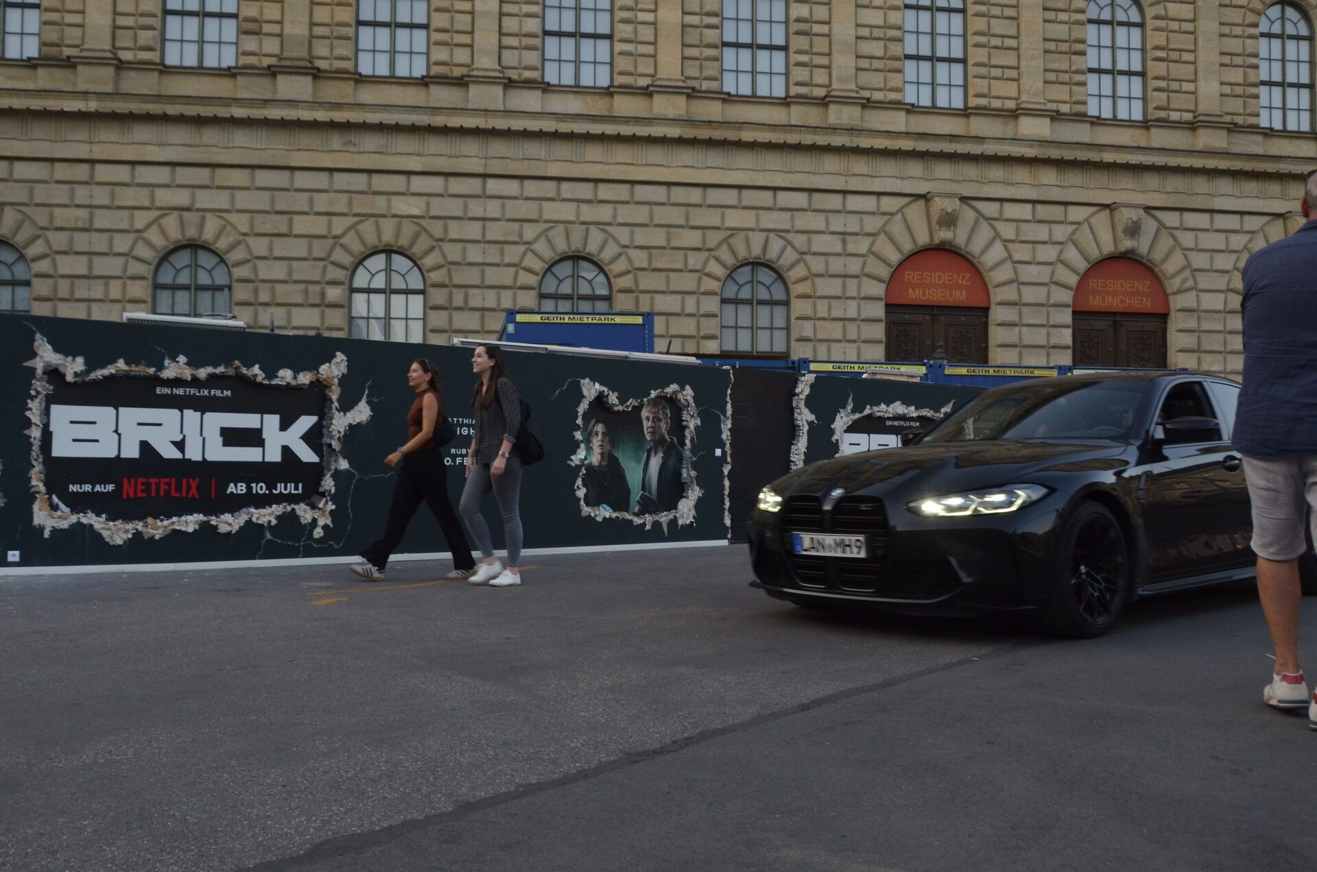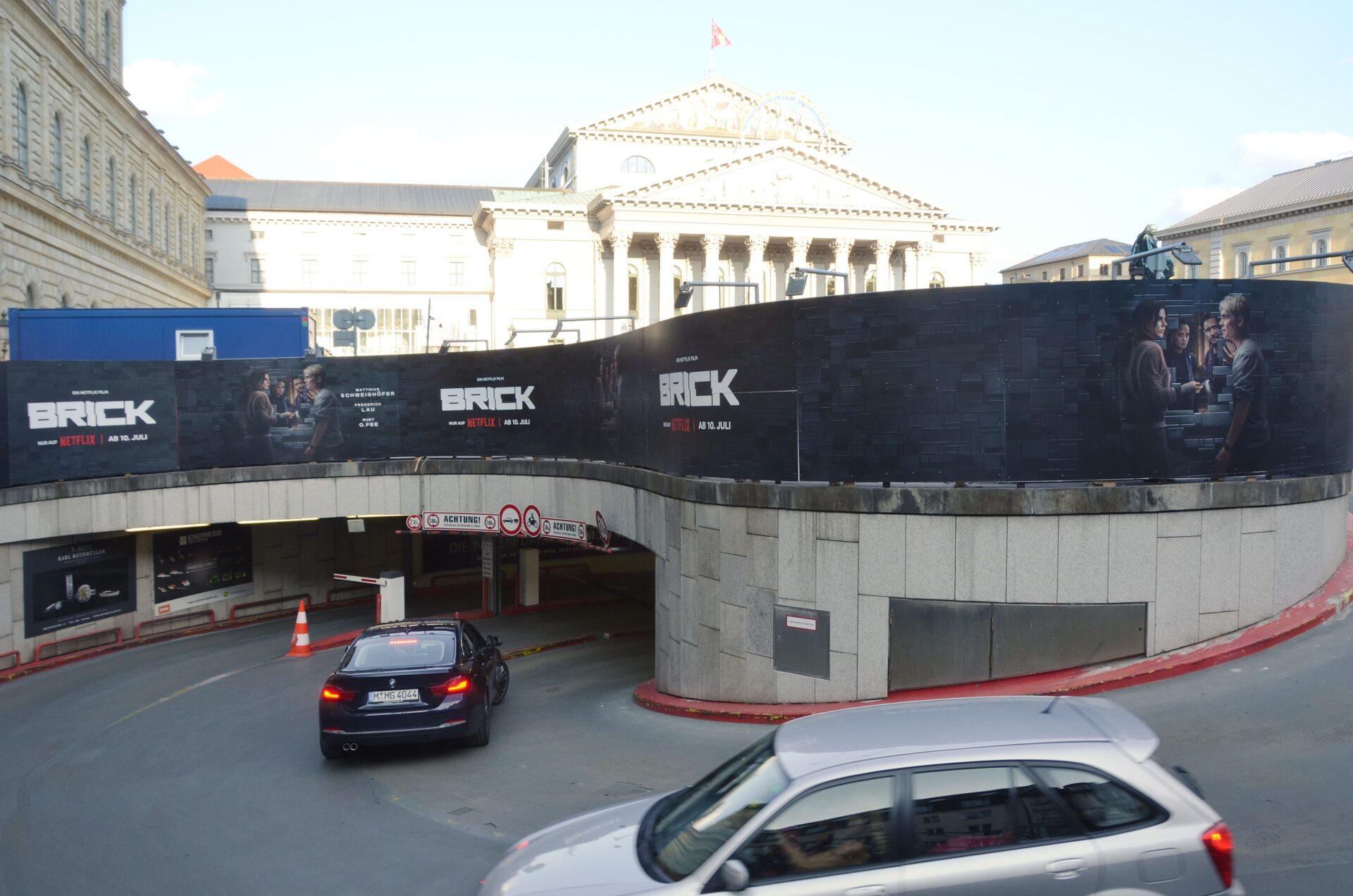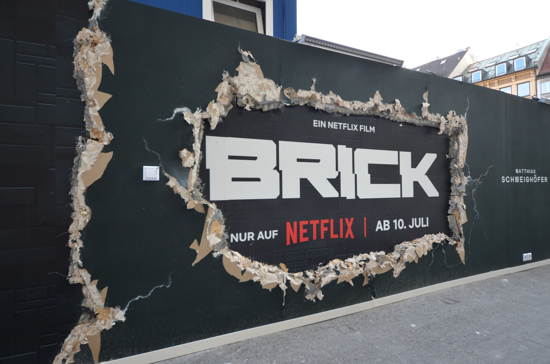 In the heart of Munich city centre, directly on Max-Joseph-Platz between the Residenz and the opera house, CONCRETE CANDY has transformed a construction fence into a remarkable stage. For the Netflix film ‘Brick’, an extraordinary installation was created that goes far beyond classic poster advertising: hand-painted scenes and characters that appear to break through the wall.