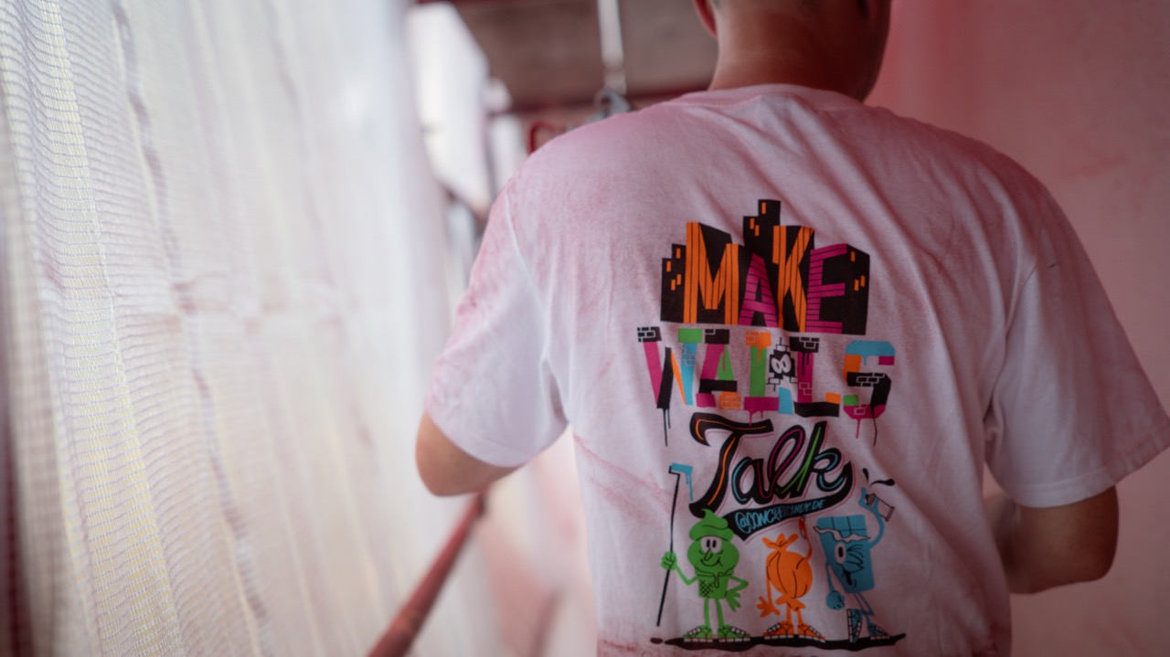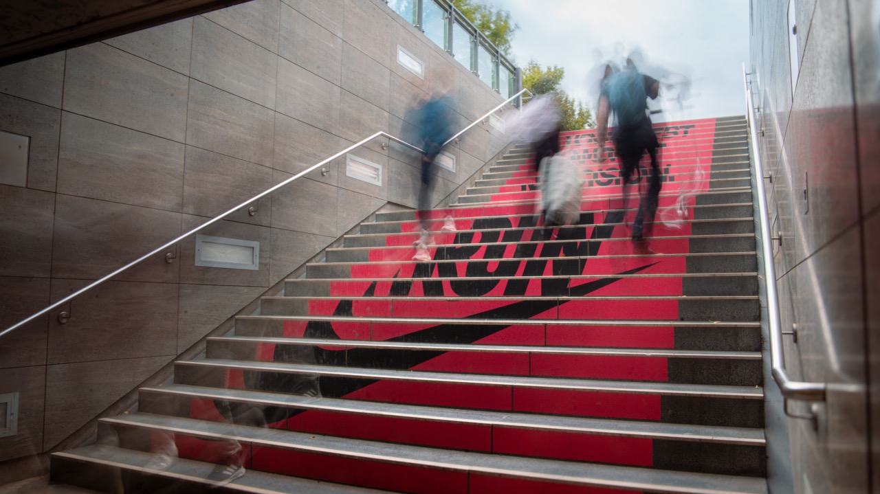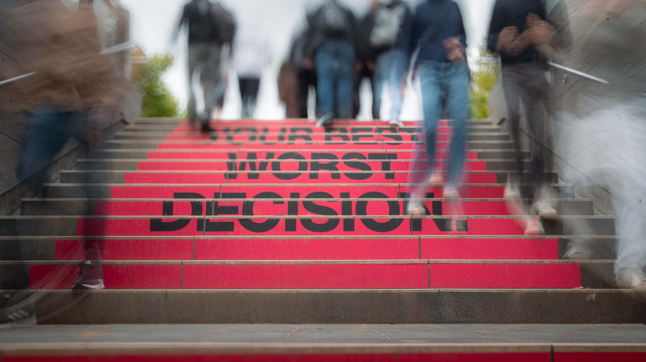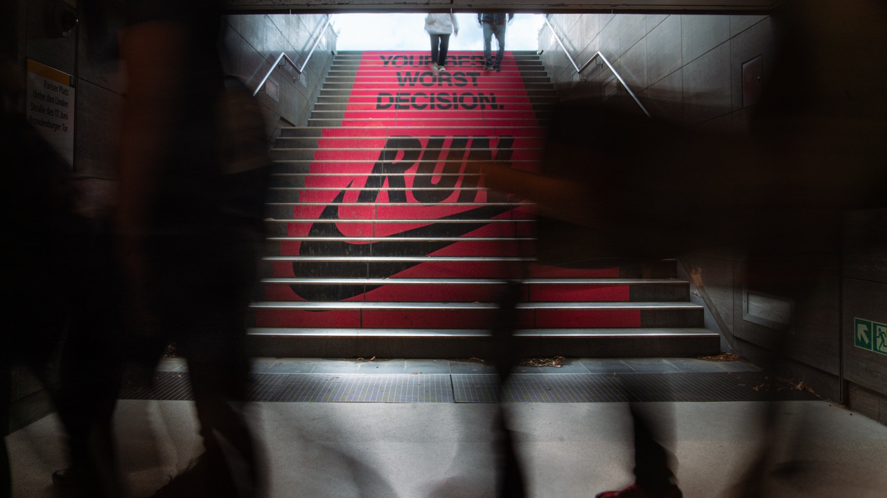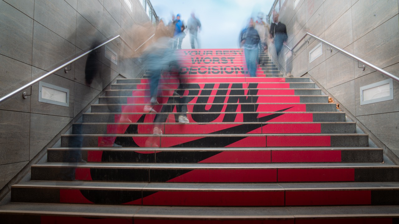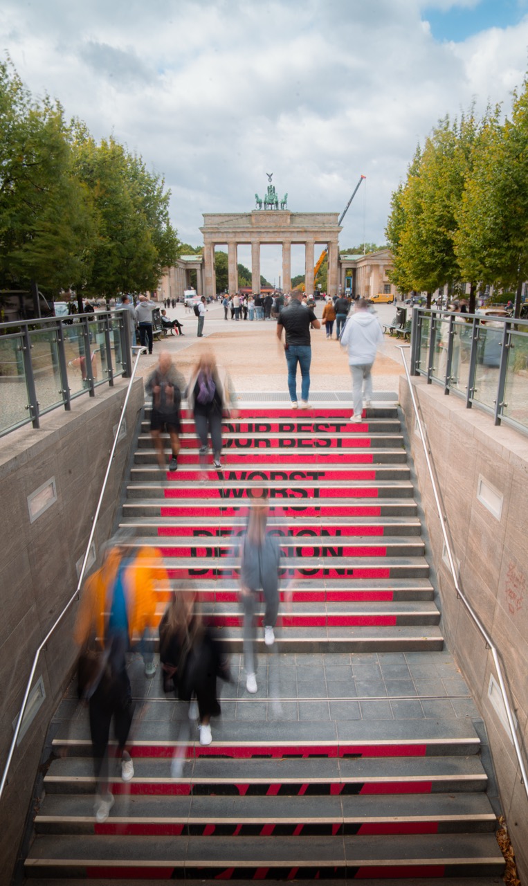 But the urban space was also given further consideration. At the Brandenburg Gate subway station, an everyday staircase was transformed into a motivational intervention thanks to foil in the same strong colors as the mural. “Your Best Worst Decision” runs step by step upwards and perfectly prepares Berliners and their guests for the upcoming Berlin Marathon.