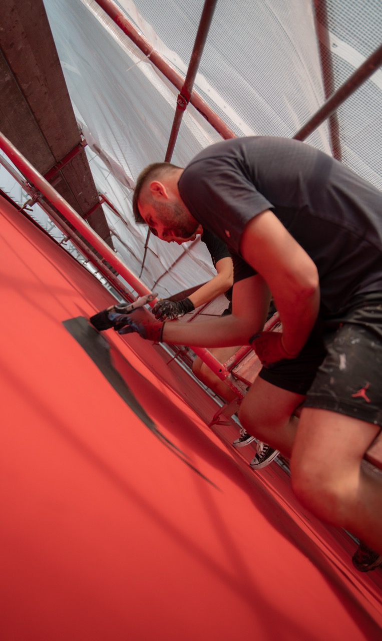Before the first steps of the Berlin Marathon could be taken, it all began on the huge scaffolding. Layer by layer, a massive red surface was created in the middle of Kurfürstendamm. On top of that, there was precise typography, clear contrasts, and an absolutely uncompromising size—raw, visible, and unmissable, true to the motto: “I see a red wall and I want to paint it black!”, inspired by the great Stones.